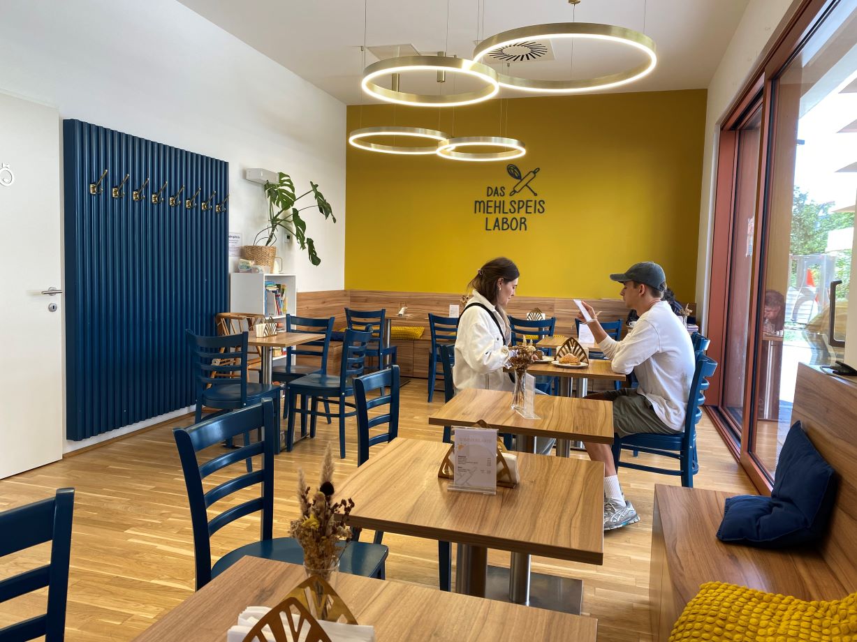 „Versteckt“ in einem Wohnhauskomplex, umgeben von mehreren Schulen, liegt das Mehlspeislabor. Schon beim Betreten fällt die freundliche Farbwelt ins Auge: Gelb und Blau dominieren – von Polstern über Holzsessel bis hin zur Verkleidung der Vitrinen. Die großzügige Glasfront lässt viel Tageslicht herein und kann im Sommer geöffnet werden, sodass der Übergang zum Schanigarten fließend wird. Während Kinder am angrenzenden Spielplatz spielen, genießen Erwachsene entspannt ihren Kaffee und die süßen Kreationen. Auch im Winter ist für die Kleinen gesorgt: Eine gemütliche Spielecke im Innenbereich sorgt für Unterhaltung.